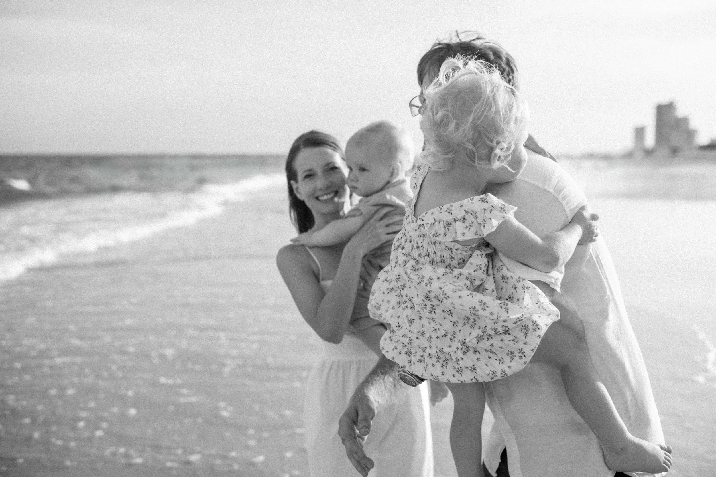 Family group on beach sand dunes with ocean and sky in background, holding children and smiling.
